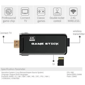 گیم استیک Game Stick 4K Ultra HD یکی از کنسولهای بازی مدرن است که به گیمرها این امکان را میدهد که به بازیهای مختلف با کیفیت تصویری بسیار بالا دسترسی داشته باشند. این کنسول به صورت مخصوص برای پخش بازیهای مختلف از پلتفرمهای مختلف طراحی شده است و به راحتی میتوان آن را به تلویزیون متصل کرد.