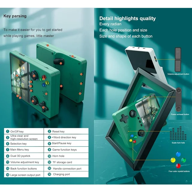 کنسول داخلی بازیهای شبیه ساز قدیمی با بیش از 10000 بازی کلاسیک، صفحه نمایش 3.5 اینچی OCA IPS، جوی استیک سه بعدی دوگانه، پشتیبانی از 11 کنسول شبیهساز، خروجی تلویزیون پشتیبانی از کنسول شبیهساز دستی